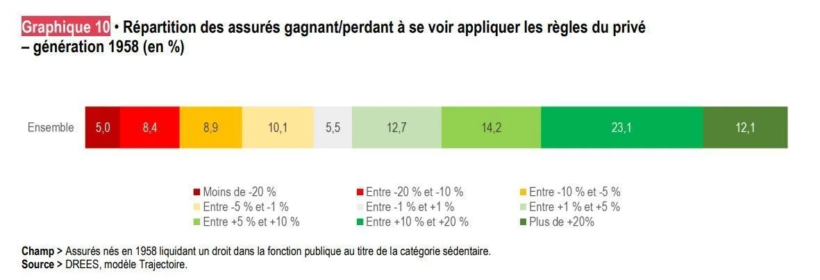 Baisse moyenne des pensions de retraite de 10% pour les perdants. Ils seraient 13% à subir cette baisse. Pour ces agents de la fonction publique, ayant des rémunérations les plus élevées, la Drees évalue qu’un changement de ce type serait synonyme de forte baisse des pensions. Ainsi, les écarts entre niveaux de pension entre tous les agents de la fonction publique se resserreraient.