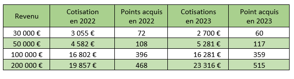 Par exemple, un affilié à la CIPAV percevant une rémunération nette de 33 944 € doit s’acquitter d’une cotisation de 3 055 € en 2022 et en 2023, mais il obtient 72 points en 2022 et seulement 67 en 2023.