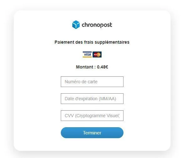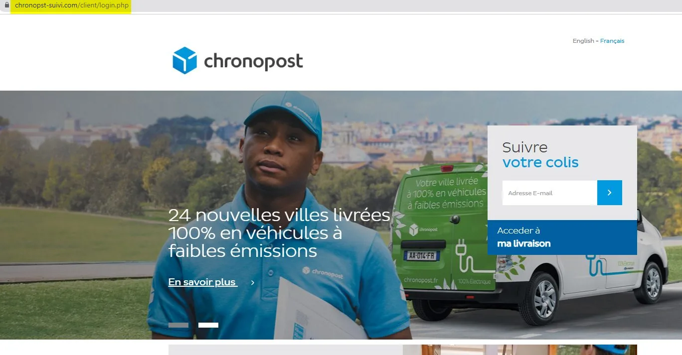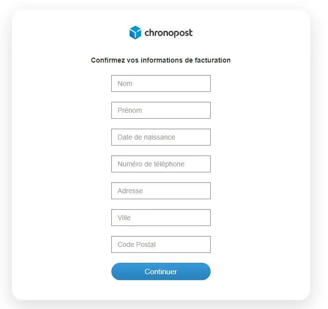 En suivant l’url que vous avez reçu, vous serez redirigé vers un site qui apparaît comme étant de Chronopost. Mais ce ne sera qu’une copie. En scrutant avec attention l’url dans la barre d’adresse de votre navigateur, vous pourrez vous apercevoir qu’il manque une lettre ou qu’un suffixe a été ajouté. Dans tous les cas, ce n’est pas le site officiel.