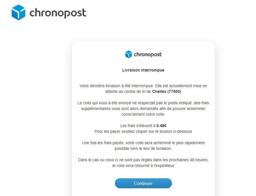 Arnaque / Chronopost : livraison de colis interrompue pour poids indiqué dépassé, une escroquerie qui fonctionne bien !