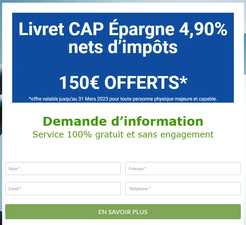 De nombreux épargnants reçoivent en ce moment une offre de livret épargne via courriel (spam, courriel non sollicité) qui est une escroquerie au vol de données personnelles. Sous couvert d’une proposition d’un livret épargne au taux attractif de 4. 90% net d’impôt (ce qui est évidemment impossible, proposer un taux net d’impôt en dehors de l’épargne réglementée tient du domaine de l’escroquerie), assortie d’une prime de 150 euros, le but de l’envoi est donc de collecter les données de prospects attirés par des rendements élevés. L’escroquerie porte sur la capture de données personnelles permettant d’être rappelé par la suite pour des propositions de placements qui n’ont rien de sans risque pour le capital. Le site Internet est bien réalisé, mais toutefois l’arnaque est facile à déceler car les mentions légales sont fausses et largement incomplètes. Par ailleurs, aucune mention n’est faite de déclarations auprès des autorités de contrôle, ce qui est pourtant obligatoire.