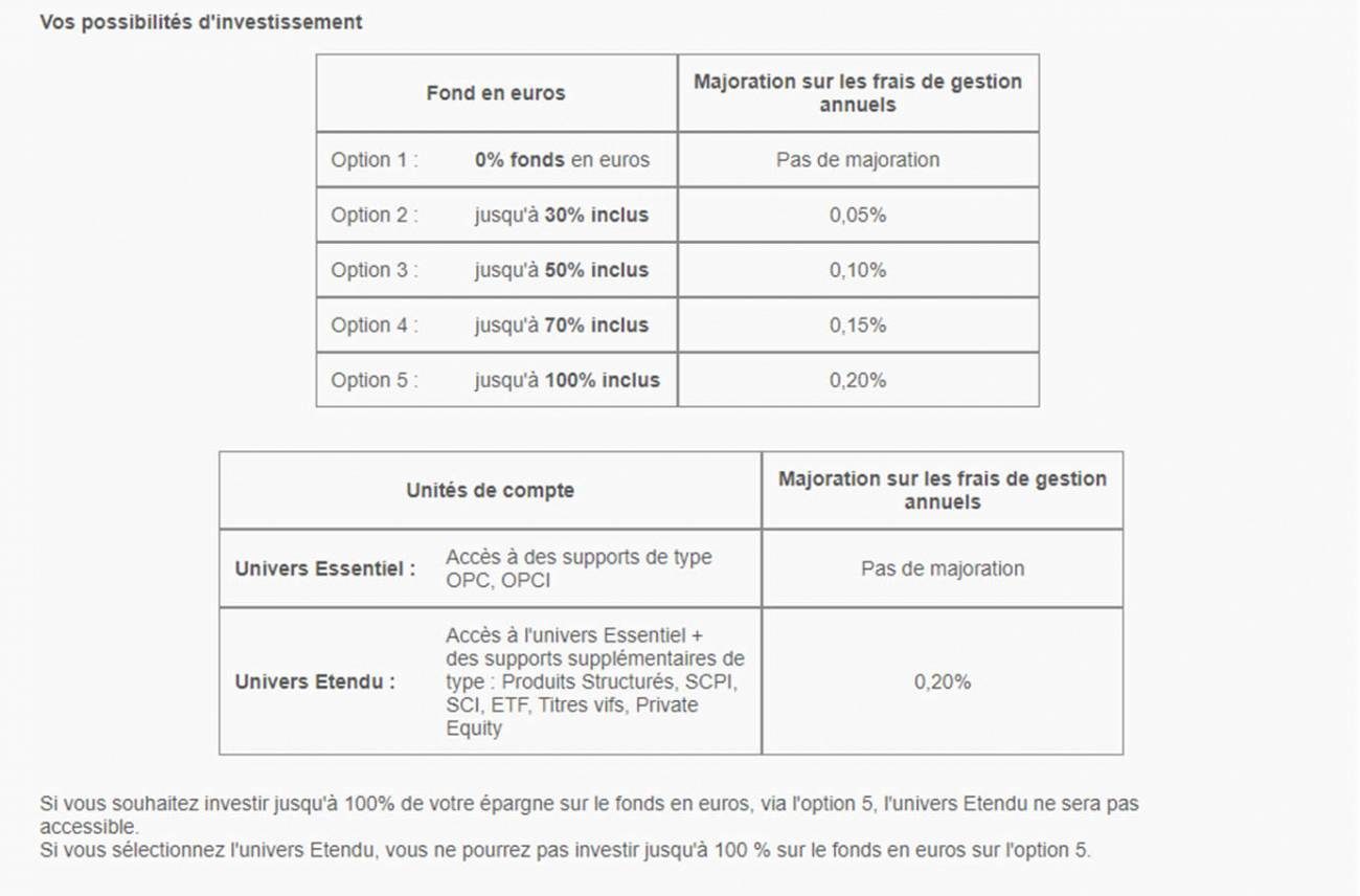 Univers d’investissement en unités de compte « Essentiel » : Accès à des supports de type OPCVM, OPCI Univers d’investissement en unités de compte « Etendu » : Accès à l’univers Essentiel + des supports supplémentaires tels que des produits Structurés, SCPI, SCI, ETF, Titres vifs, Private Equity.