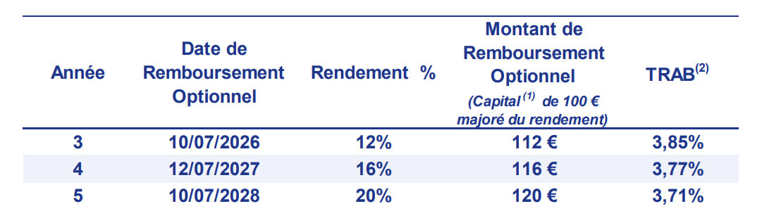 La particularité de cette proposition d’investissement obligataire que la période maximale est de 6 années. Toutefois, l’émetteur peut anticiper le remboursement à l’horizon de 3, 4 ou 5 ans. L’épargnant doit donc impérativement partir dans l’idée de placer son capital sur une durée de 6 ans. Il est rappelé que toute demande de rachat avant le terme du placement peut potentiellement être source de moins-values.