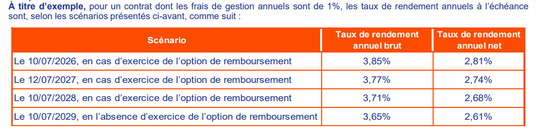 Critère important, le rendement servi est un coupon de 4% brut. La subtilité étant que ce coupon ne sera versé qu’au terme du placement et non pas chaque année.