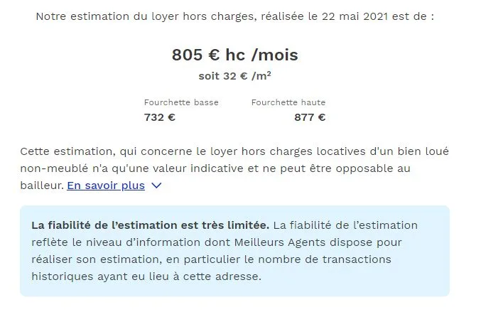 Second bémol : l’outil ne semble pas tenir compte des plafonds de loyers imposés pour les villes imposant de telles mesures. En Effet, dans notre essai (un studio de 25 m2 situé à Paris 20e - Rue de Bagnolet), l’outil indique un montant de loyer qui est illégal, car trop élevé par rapport aux plafonds de loyers imposés actuellement pour un bien nu.
