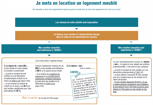 Le Fisc a précisé les choses concernés les logements meublés, loués même à titre occasionnel. Le régime du micro-BIC (plafond inférieur à 70.000€) de recettes ou BIC (supérieur ou égal à 70.000€) est appliqué. Le contribuable peut cependant opter pour le régime réel, même en ayant des loyers inférieurs à 70.000€ par an (article 50-0 du CGI). Pour être recevable, l’option doit être exercée avant le 1er février de la première année pour laquelle le contribuable veut être soumis au régime réel.