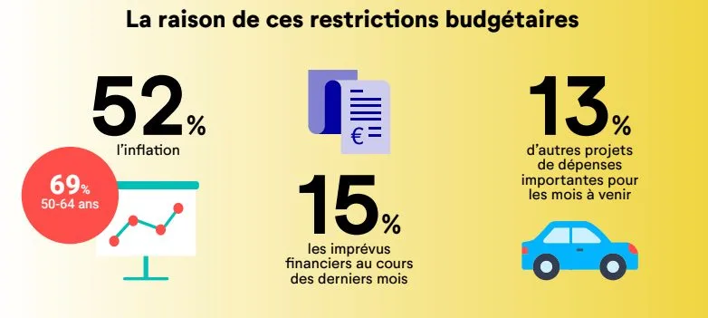 Chiffre fort de cette enquête, 64% des Français ont le sentiment qu’ils vont devoir se restreindre sur leur budget vacances - une donnée qui grimpe à 77% chez les 18-24 ans. La raison principale de ces restrictions budgétaires ? L’inflation pour une nette majorité (52%) des vacanciers (69% chez les 50-64 ans). Loin derrière arrivent ensuite des imprévus financiers au cours des derniers mois (15%), d’autres projets de dépenses importantes pour les mois à venir (13%), le fait de ne pas avoir d’épargne de côté (10%) ou encore un projet de vacances avec un coût plus élevé que prévu (9%).