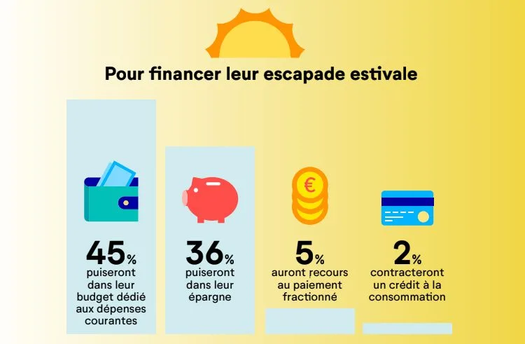 Pour financer leurs congés, les Français puiseront pour la plupart dans leur budget dédié aux dépenses courantes (45%), tandis que 36% d’entre eux iront puiser dans leur épargne personnelle. Le paiement en 3 ou 4 fois sans frais, utilisé par 5% des vacanciers, est particulièrement plébiscité par les jeunes de 18-24 ans (15%). Enfin, 5% des Français auront recours à l’aide de leur famille et 2% au crédit à la consommation.