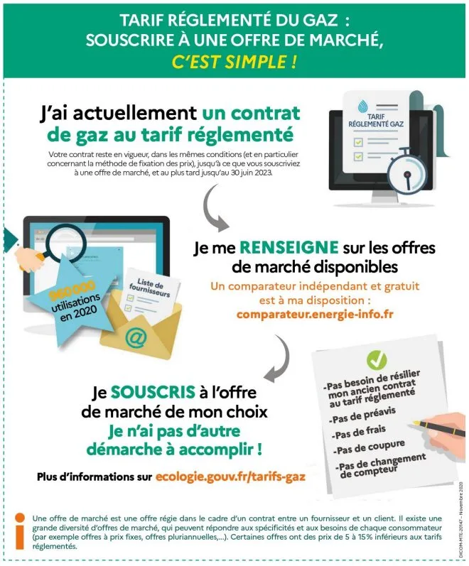 Le 30 juin 2023, les tarifs réglementés de vente de gaz naturel vont totalement disparaître au profit des offres de marché. Votre fournisseur actuel doit vous adresser un courrier dans ce sens. Vous devrez alors comparer les offres du marché.
