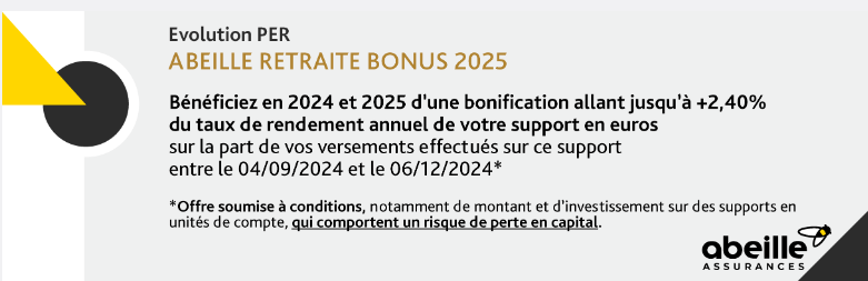 Le montant minimum doit être de 5 000€ pour un versement. Le montant cumulé des versements effectués dans le cadre de l’opération Abeille Retraite Bonus 2025 est au maximum de 500 000€ pour un(e) même contrat/adhésion.