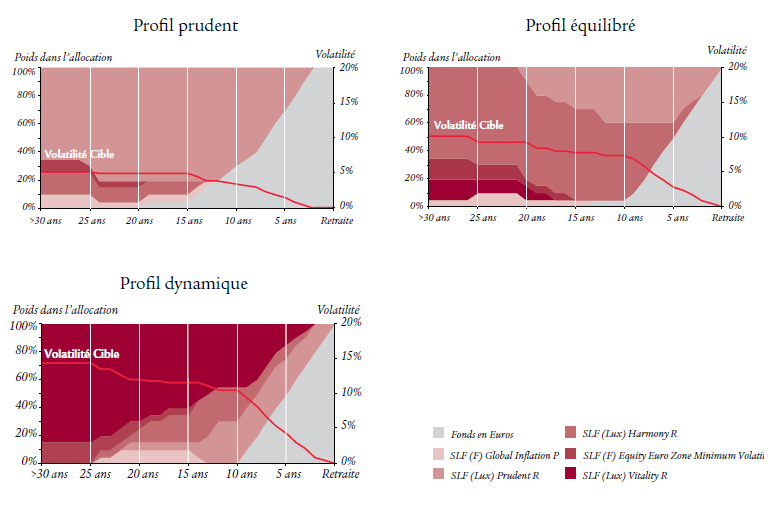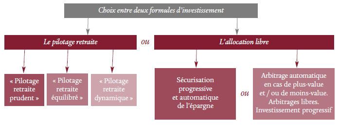 En choisissant cette formule, vous bénéficiez en permanence de l’allocation d’actifs la mieux adaptée à votre horizon de départ à la retraite. Votre épargne est dynamisée sur le long terme puis sécurisée progressivement à l’approche de votre départ à la retraite.3 pilotages retraite vous sont proposés en fonction de votre profil d’investisseur : Prudent, Équilibré et Dynamique.