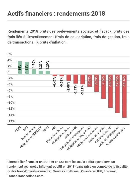 En tenant compte de l’inflation (1.8% sur 2018), seules les SCPI et les SCI servent des rendements bruts réels positifs sur 2018 (hors prise en compte des frais d’investissement, évidemment... Car sinon, de fait, tous les actifs seraient dans le rouge).
