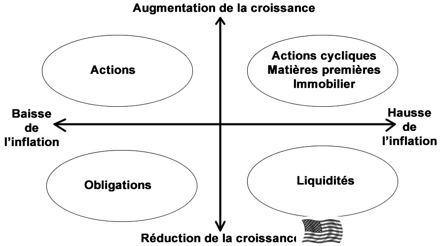 | La position du drapeau de la zone géographique (USA en l'occurence) sur le schéma indique la ou les classes d'actifs financiers à privilégier. Sa position est calculée en fonction de la variation des indicateurs marcoéconomique de l'inflation et de la croissance. (dernière mise à jour effectuée le 24 mars 2025) | |||||